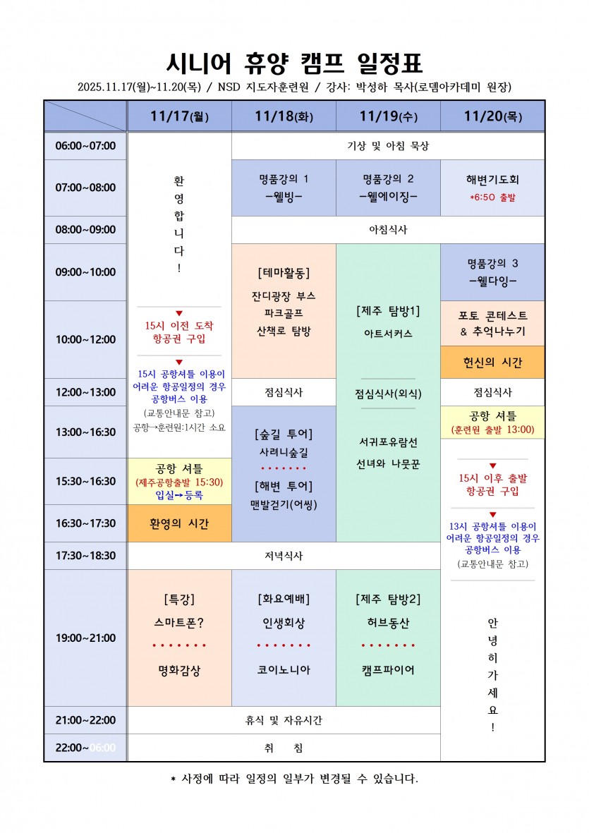 행복한 노년을 위한 "시니어 휴양 캠프"가 제주 지도자훈련원에서 개최됩니다.